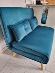 Bardzo ładna sofa w morskim kolorze. Łatwo sie rozkłada. Jest stosunkowo lekka, ok. 30 kg. Mieści w bardzo małym salonie.