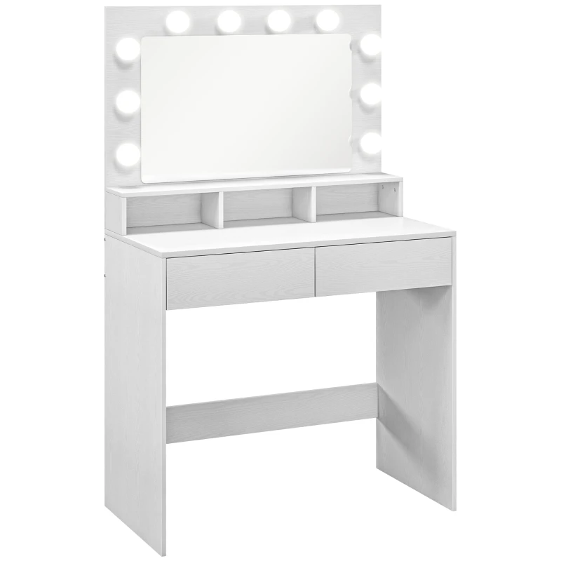 Toaletka HOMCOM z oświetleniem LED, toaletka z lustrem, regulowana jasność, kosmetyczka z 2 szufladami, otwarte półki, do sypialni, biała(m-12)