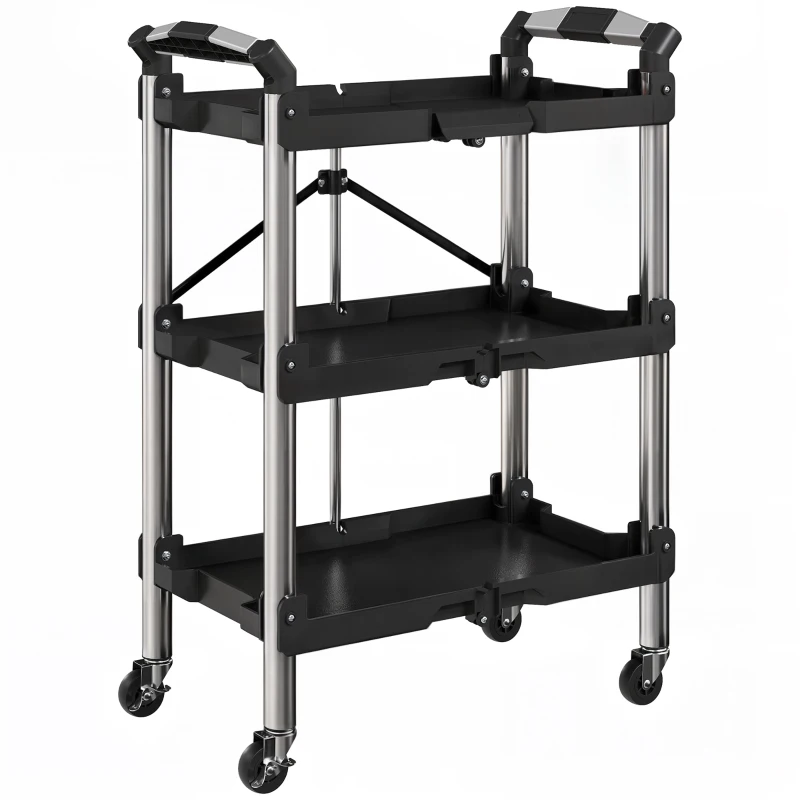 HOMCOM Wózek warsztatowy z 3 półkami, Składany wózek narzędziowy z uchwytem, Wózek montażowy dla magazynu, garażu, do 68 kg, Czarny
