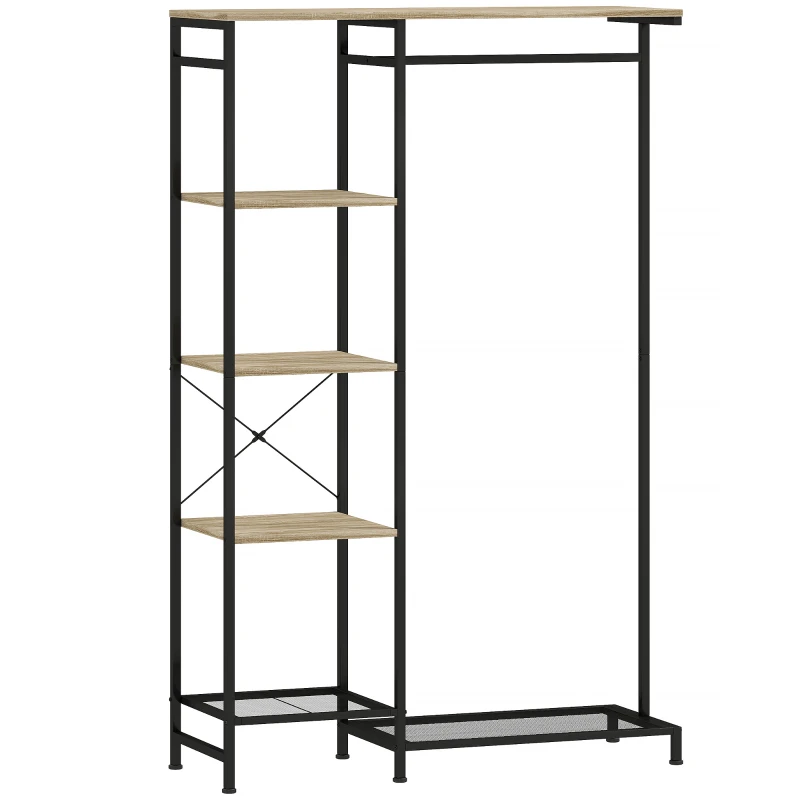 HOMCOM Freestanding Coat Rack Stand, Modern Hall Tree with Clothes Rail, Mesh Shoe Rack and Metal Frame for Hallway, Living Room, Bedroom, Oak and Black