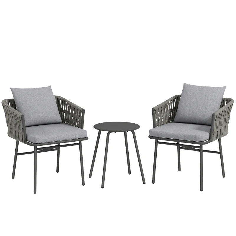 Outsunny 3-Piece Rattan Bistro Set, Garden Table and Chairs with 4 Cushions, Patio Rattan Conversation Furniture Set for Balcony, Porch, Terrace, Grey