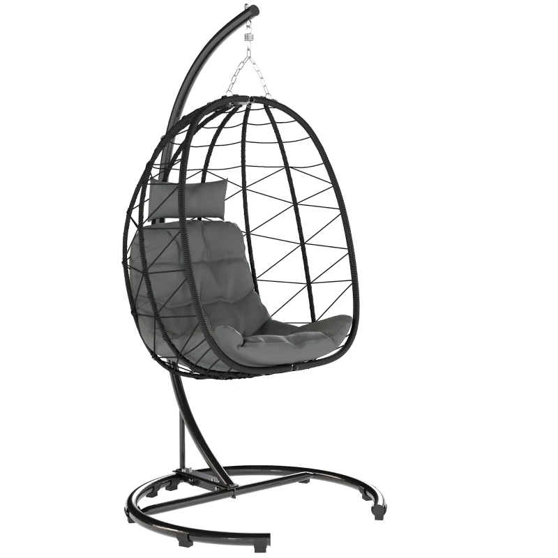 Outsunny Fotel wiszący z wikliny, fotel wiszący o wysokości 195 cm, kosz huśtawki do użytku wewnątrz i na zewnątrz, w zestawie stelaż, poduszka, wodoodporna pokrywa, do 150 kg, kolor ciemnoszary