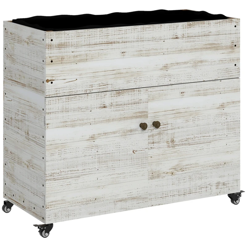 Outsunny Podwyższane grządki z drewna, szklarnia z szufladą, skrzynia ziołowa na kółkach, donica, skrzynka na kwiaty z materiałem włóknistym do ogrodu, balkonu, 110 x 50 x 95 cm, biały
