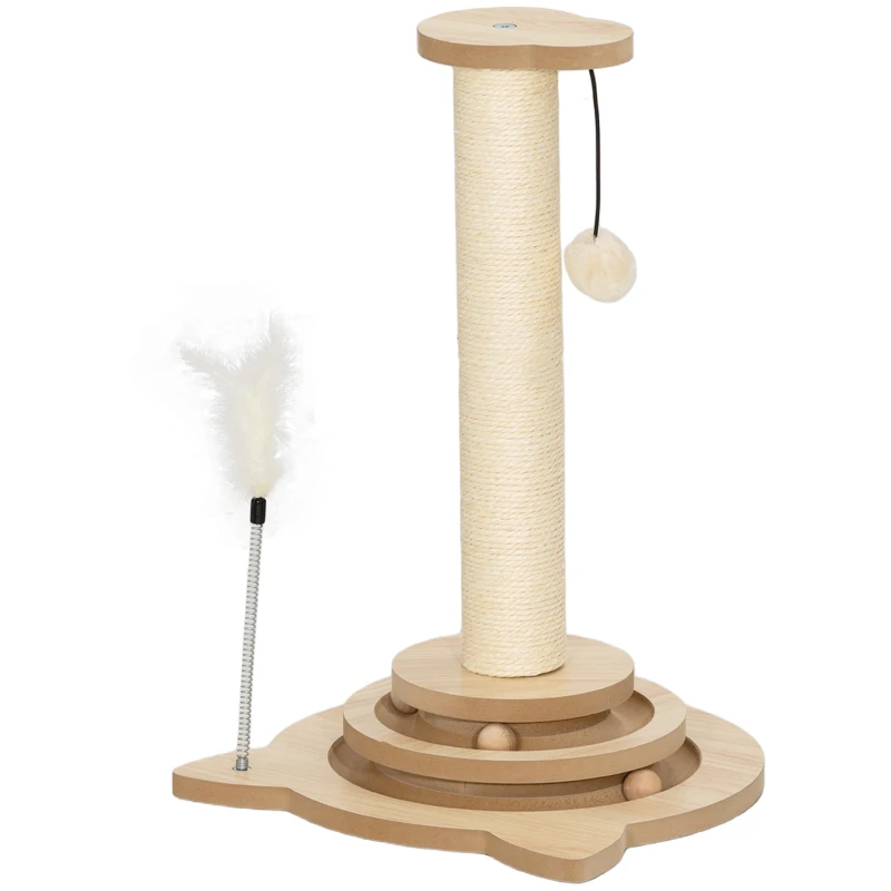 PawHut Cat Scratching Post, 49cm Cat Scratcher with Sisal Post, Interactive Track Ball Toy, Hanging Toy Ball, Feather, 4 in 1 Small Kitten Cat Scratch Post, Oak