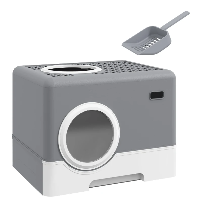 Kuweta PawHut dla Kotów z Pokrywą, Kuweta z Łopatką, 2 Wyjścia, Toaleta dla Kotów do 4 kg, Tworzywo Sztuczne, Szary, 52 x 41 x 38,5 cm